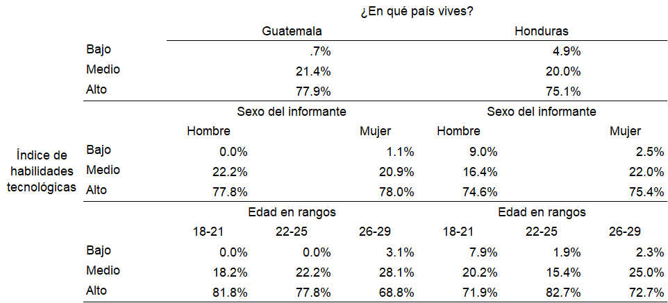 El Índice de habilidades tecnológicas se puede clasificar como de nivel alto dado que en ambos países cerca de tres de cada cuatro entrevistados se agrupan en esta categoría. La única diferencia observable es en el nivel bajo del índice, donde en Honduras hay un 4.9 % comparado con el 0.7 % en Guatemala. Dado que son estudiantes universitarios este nivel debería ser cero. (Tabla 2)