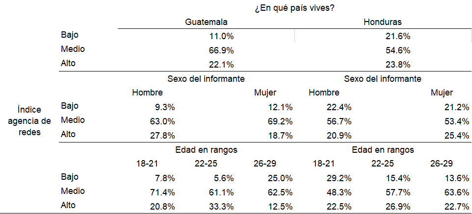 El índice de agencia de redes también muestra que según el grupo de edad hay diferencias entre países, para el caso, en Guatemala, a mayor edad presenta mayor proporción de jóvenes con nivel bajo del índice, pero no ocurre exactamente lo contrario con menor edad, el mayor porcentaje de jóvenes con nivel alto del índice se ubican entre los 22-25 años. En el caso de Honduras, llama la atención que, a menor edad es mayor el porcentaje de jóvenes con nivel bajo y los de mediana edad (22-25) son quiénes muestran la mayor proporción de jóvenes en nivel alto.