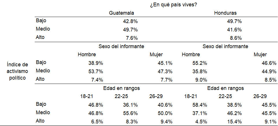 En Guatemala, las mujeres tienen un mayor porcentaje de nivel bajo del índice de activismo político, es decir, participan menos en la vida política del país. Sin embargo, la mayor parte de jóvenes hombres y mujeres tienen un nivel medio. Solo un siete por ciento en ambos sexos tienen un nivel alto de participación. Mientras en Honduras, más de la mitad de los hombres tienen nivel bajo, nueve puntos porcentuales más que las mujeres hondureñas. En el nivel alto ambos porcentajes son similares. (Tabla 5).