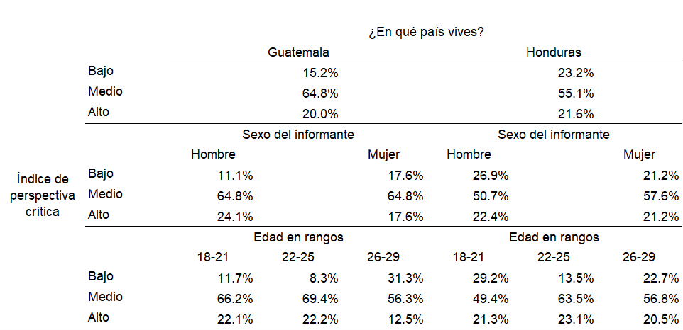 El Índice de perspectiva crítica que reúne los ítems acerca de la participación en internet para cambiar las cosas injustas, así como de reflexión acerca de los dominios del sistema, este índice se clasifica como de nivel medio. Al compararlo entre los países, en Guatemala el nivel bajo es de 15.2%, ocho puntos porcentuales menor que sus pares hondureños. En el nivel medio se ubican las mayores proporciones de ambos países. Y en el nivel alto, uno de cada cinco en los dos lugares (Tabla 6).