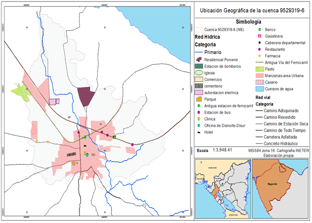El universo corresponde a la cuenca 9529319- 6 que tiene una extensión de 16.37 km2, se ubica en el municipio de Nagarote, departamento de León (Ver figura 1). En la realización del modelado hidrológico en la cuenca, se tomó como muestra solamente el río seco de todos los afluentes presentes. La razón fundamental es que este río seco atraviesa de norte a sur el área urbana (línea azul en el mapa) del municipio de Nagarote considerándose esta área, como la más crítica por el desbordamiento de las aguas; además de ser la zona más habitada y con mayor exposición al riesgo.