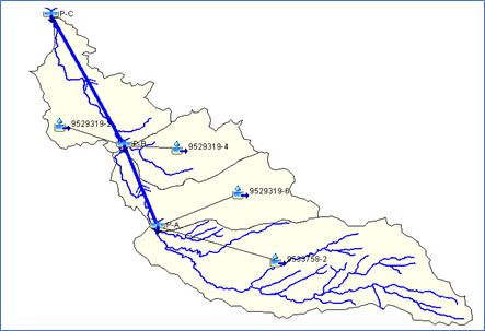Etapa 4. A partir de los hidrogramas unitarios y haciendo uso del método Muskingum se realizó el tránsito de avenida utilizando el software HEC-HMS, obteniéndose el caudal máximo de un evento extremo (tormenta) en los periodos de retorno definidos en este estudio. Es importante destacar que el río se extiende por 16 km lineales y atraviesa varias cuencas, por lo tanto, se transitaron en la 9529319-4, 9529319-6, 9533758-2 y 9529319-2 (ver figura 2).