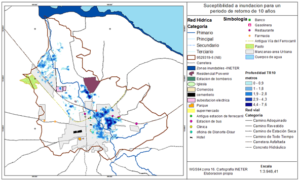 Figura 4. Zonas susceptibles y profundidad de la lámina de agua por inundación tiempo de retorno 10 años