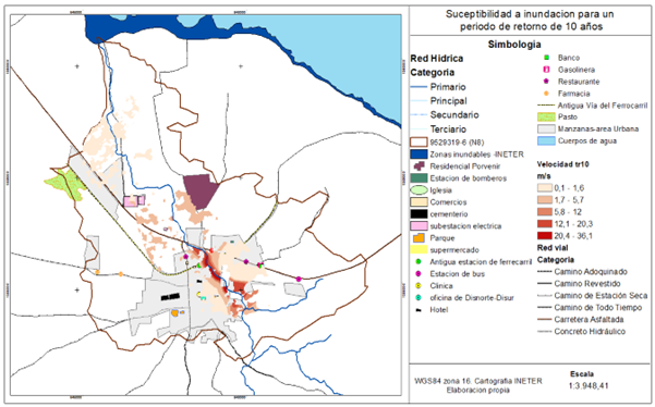 Figura 6. Zonas susceptibles a inundación y velocidad del agua tiempo de retorno 10