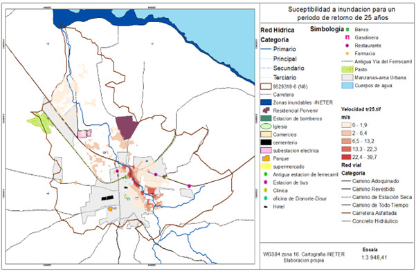 Figura 7. Zonas susceptibles a inundación y velocidad del agua tiempo de retorno 25