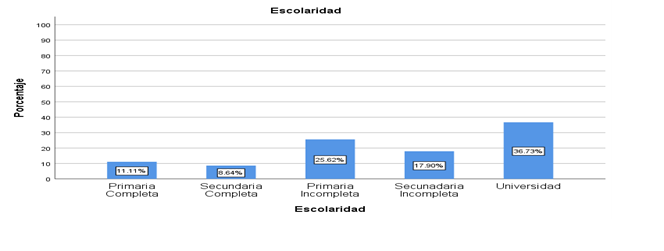 Respecto a la escolaridad referida de los pacientes fue primaria completa el 11.1% (n= 33); primaria incompleta, el 25.6% (n= 29); secundaria completa, el 8.6% (n= 84); secundaria incompleta, el 17.9% (n= 59) y universidad, el 36.7% (n= 120).
