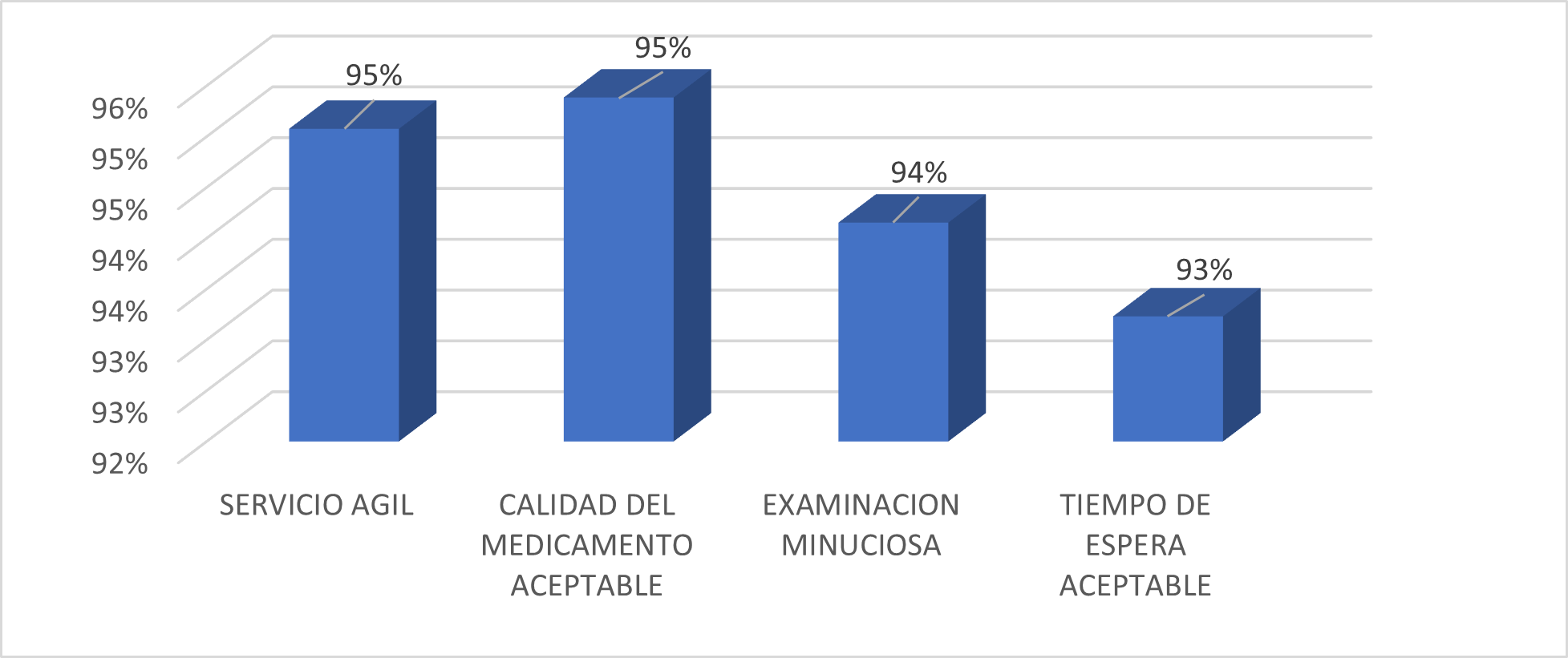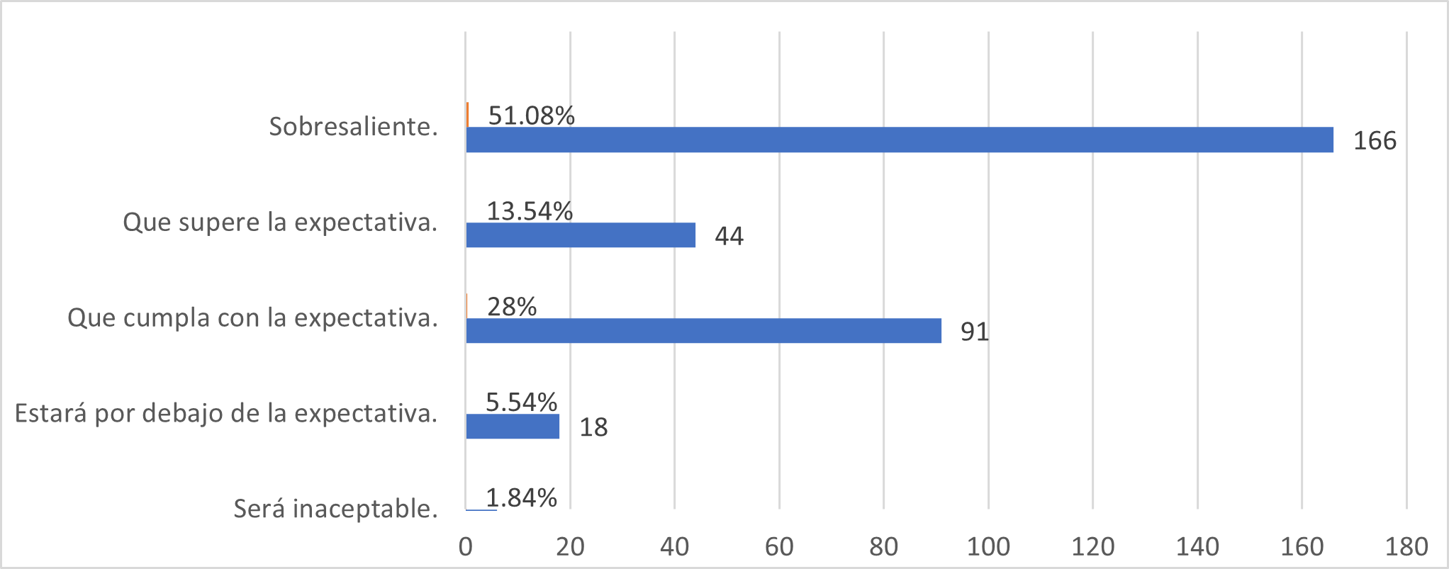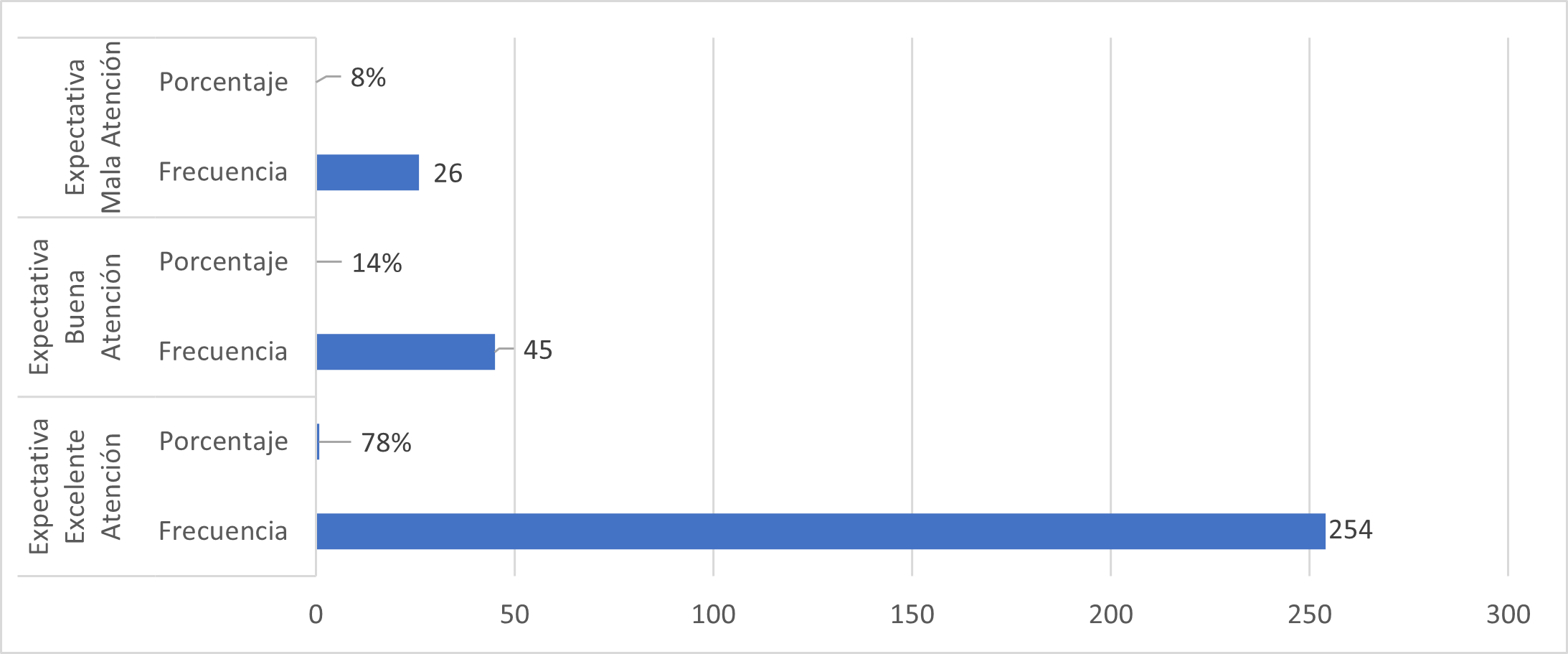 La figura 3, revela los miembros de la muestra (n= 325), el 78% de los encuestados (n= 254), refirieron que esperaban una calidad en la atención excelente, el 14% una buena atención (n= 45) y el 8% manifestaron que estaban predispuestos a una mala atención (n= 26).