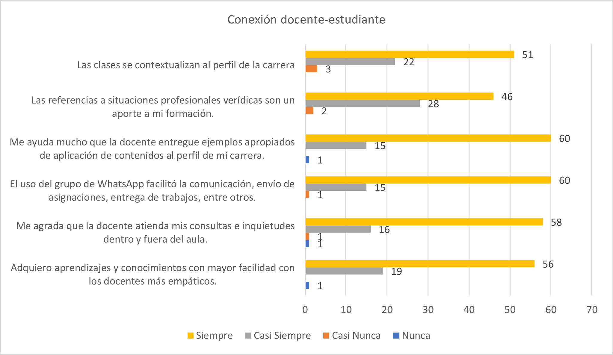 La Figura 1 muestra que los ítems más valorados por el estudiantado fueron: la empatía del docente, la disposición para atender sus inquietudes dentro y fuera del aula, y el uso de WhatsApp para mantener comunicación fluida. Esta plataforma se utiliza para enviar y recibir tareas, aclarar dudas y retroalimentar el proceso de aprendizaje de cada estudiante.