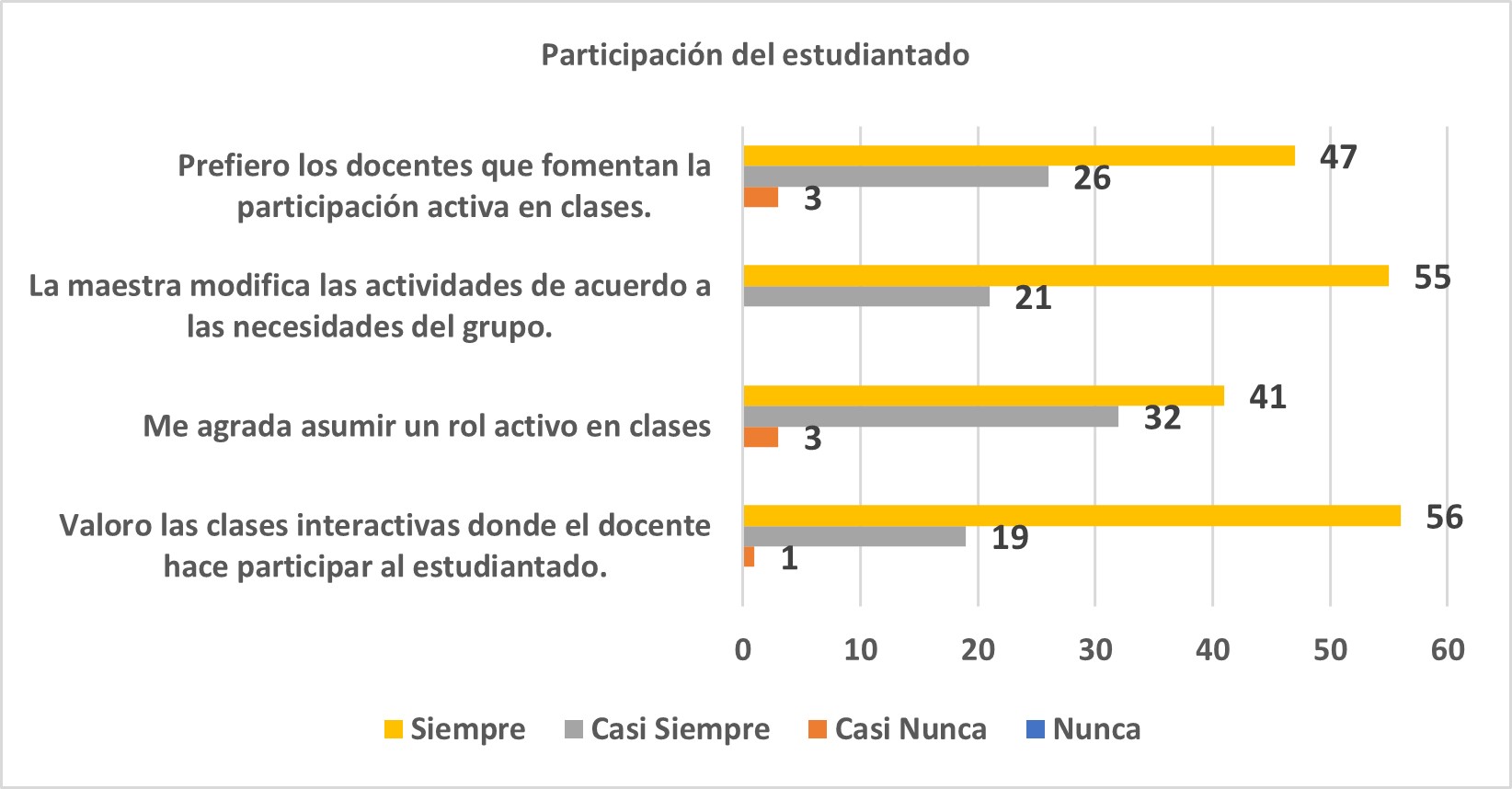 Lo antes expuesto, fundamenta los resultados planteados en la Figura 4 donde el estudiantado valora que el docente les permita participar activamente en el proceso de aprendizaje, sobre todo porque modifica las actividades de acuerdo a las necesidades presentadas en el aula de clase. Coinciden con los hallazgos del estudio realizado por Posso Pacheco et al. (2023) quienes afirman que la participación activa del estudiantado mediante las estrategias aplicadas por los docentes incrementa no solo la motivación, sino que fortalecen el aprendizaje significativo y el compromiso de construir aprendizaje desde, en y para la vida de manera personal y colectiva.