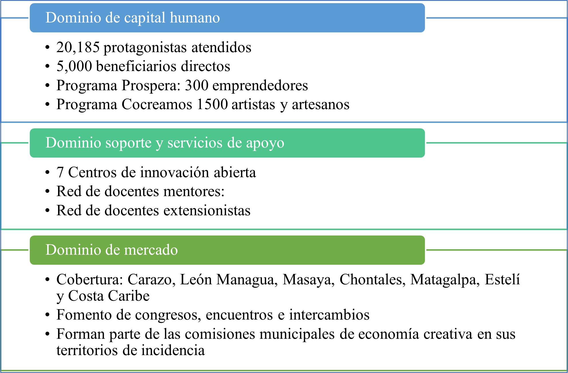 Con el impulso del Modelo de Economía Creativa, en 2020 se formuló el Programa Nacional Nicaragua Creativa, “instrumento que ha dinamizado el papel de la educación universitaria en el impulso del emprendimiento, desarrollando capacidades y competencias, y garantizando la infraestructura en espacios específicos como son: los Centros de Innovación Abierta” (GRUN, 2021, p. 50). De esta manera, su importancia radica no sólo en términos de creación de capacidades, competencias y transferencia de conocimiento; sino en su funcionamiento como punto de convergencia de los actores y del trabajo articulado, cuyos programas y proyectos promueven el emprendimiento.