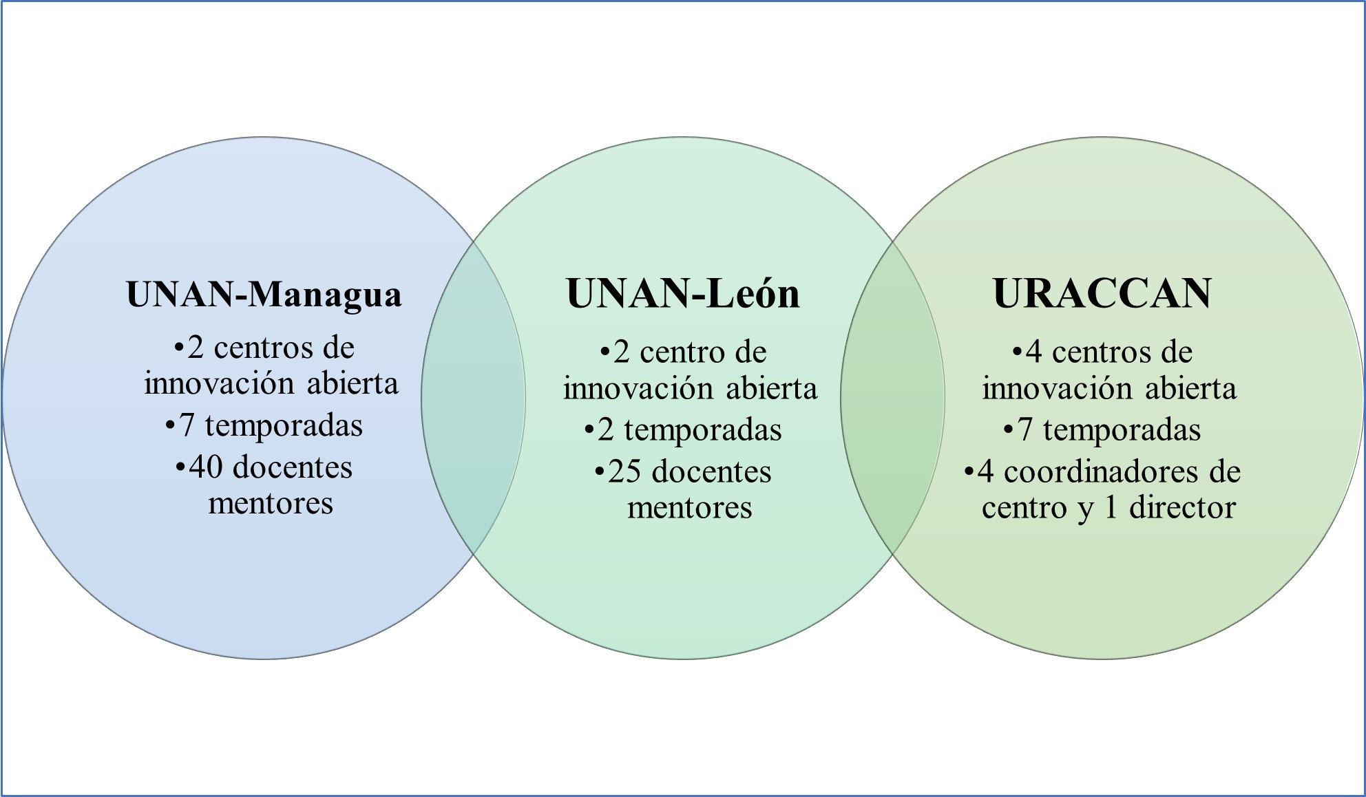 Los centros de innovación abierta, concebidos como espacios e infraestructura especializada para la innovación y el emprendimiento, conforman la ejecución de una arista principal en las estrategias de educación superior. Reforzados por la red de docentes mentores, quiénes tienen tareas directas en dichos centros, donde se inició con 40 docentes de la UNAN-Managua (Gago, 2017) que, como los describe Salinas (2022), poseen amplia experiencia en manejo de emprendimientos; mientras que la UNAN-León, conforman un total de 25 docentes mentores.