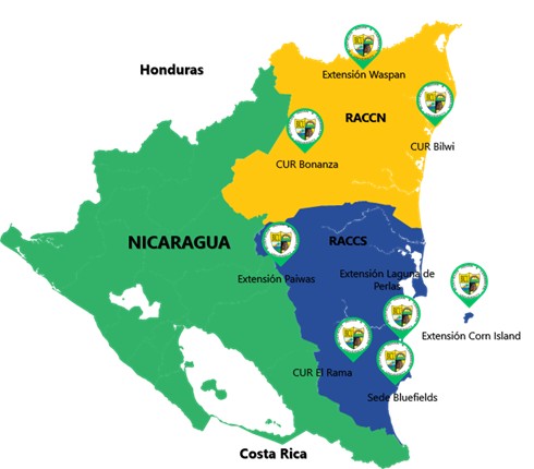 Mapa ilustrativo de la ubicación de las CUR (Centros Universitarios Regional) y Extensiones de la universidad BICU en el territorio nacional (Fuente: CEPEC).