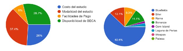 Los datos de la encuesta indican que 62.6% son del CUR Bluefields, 12.1% del CUR Bilwi, 11.1% del CUR Bonanza y 9.3% del CUR Rama. En el caso de las extensiones, Laguna de Perlas, Corn Island, Paiwas y Waspan las encuestas no superan el 3%. Los más importante de los resultados es que un 76.8% de los encuestados desean continuar con su proceso de formación, el resto (23.2%) de encuestados pueden continuar su proceso de formación en dependencia de las condiciones, las ofertas de maestrías y especializaciones y sobre todo los costos y facilidades de pago.
