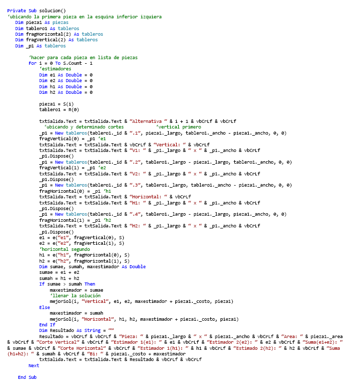 En el presente artículo se muestra la aplicación de una herramienta informática basada en algoritmos heurísticos eficientes para problemas de corte de tableros empleando el algoritmo Greedy propuesto por Martello y Toth en 1990 (Algoritmo constructivo). (Cánovas , Huertas, & Sempere, 2011) En este particular el algoritmo Greedy se utiliza para encontrar una primera solución (como punto de partida para otra heurística). Para el desarrollo de esta aplicación se utilizó Visual Studio 2010.