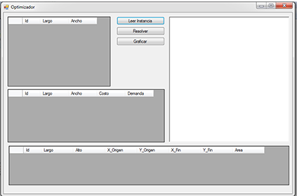 En esta interfaz inicial se muestran los botones de ID, que representa una lectura secuencial de los procedimientos, las lecturas de largo y ancho de la instancia a leer.