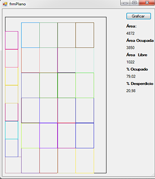 Al hacer clic en graficar, se abre una ventana con un botón graficar, al hacer clic nos mostrará la posible ubicación de las piezas dentro del tablero. Además se muestra el área ocupada, el área libre, el porcentaje ocupado y el porcentaje de desperdicio.