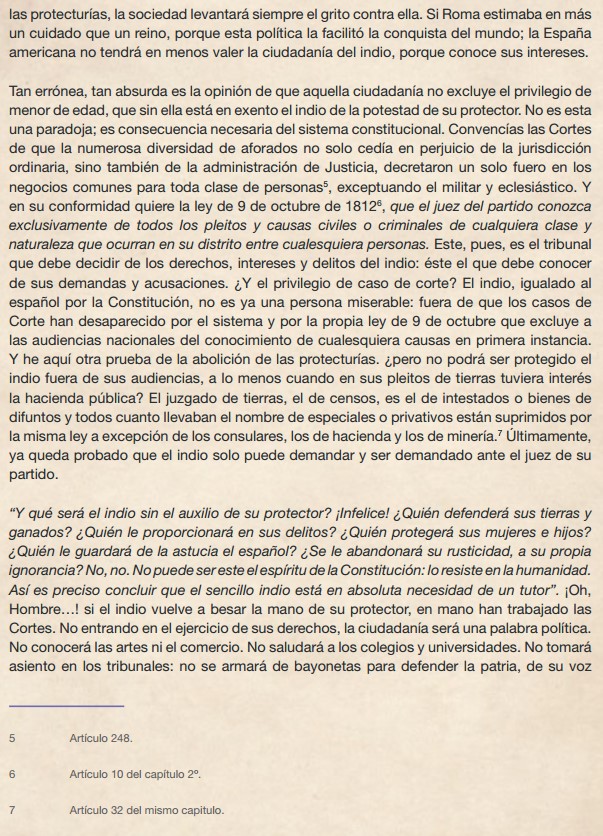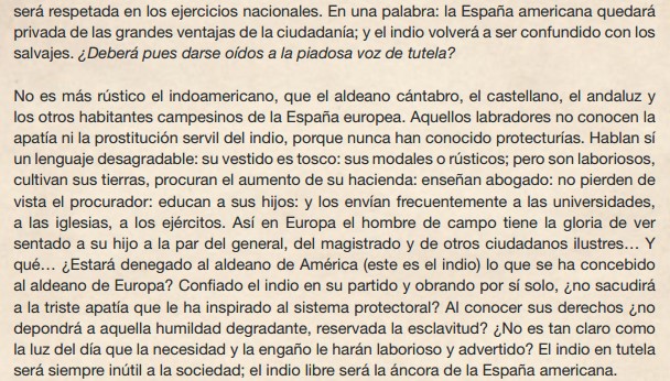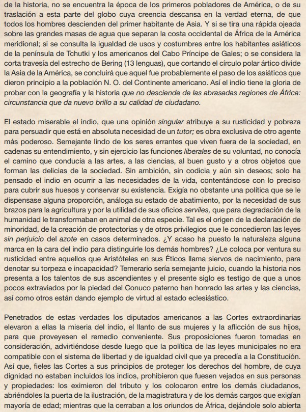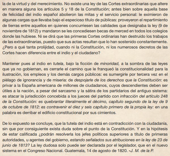 Ahora bien, en El Editor Constitucional del 14 de agosto de 1820 se publica un artículo titulado: “Ciudadanía del indio español” firmado bajo el seudónimo de J. M. de la P. en el que se exponen las razones por las cuales el indio debe ser considerado ciudadano en pie de igualdad. El autor trae a colación argumentos basados en las leyes emanadas del espíritu constitucional gaditano, abogando para que el indio sea aceptado en puestos administrativos. Por otra parte, se cuestionan las protectorías y la tutoría hacia los indios.