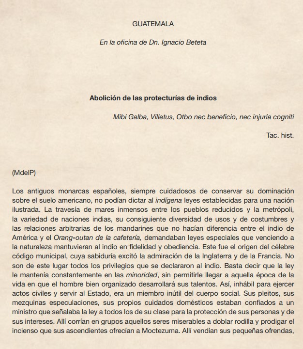 Dentro de este último contexto de apertura liberal, los intelectuales guatemaltecos y centroamericanos crean espacios de discusión sobre una variedad de temas considerados urgentes para el desarrollo de la sociedad de la época, siendo una o de ellos la situación del indio (o de las comunidades indígenas que durante el largo período colonial sobreviven), muchos de ellos buscaban canales de comunicación separados de los gubernamentales. Algunas de estas figuras o personalidades vinculadas con la élite criolla guatemalteca, aprovechan las garantías que daba la Constitución de 1812 y su restablecimiento en 1820 para la creación de periódicos como El Amigo de la Patria, dirigido por el intelectual hondureño José Cecilio del Valle (1780-1834) y El Editor Constitucional dirigido por el doctor Pedro Molina (1777-1854).