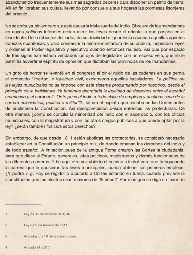 Sin embargo, para 1820 las formas de explotación a que se seguían sometido los indígenas era una realidad, pese a que desde la constitución de Cádiz este sistema fue en apariencia suprimido o desmantelado. El discurso público oficial era la incorporación del indio al nuevo sistema político y social surgido por la Constitución de Cádiz, tal como se ha venido señalando. Integración que era arropada por un nuevo lenguaje y concepto sustentado en la “ladinización” propia de la patria del criollo. Proceso de “ladinización” criticado por Martínez Peláez (2015), pues según él, esconde un engaño que legitima estructuras injustas: