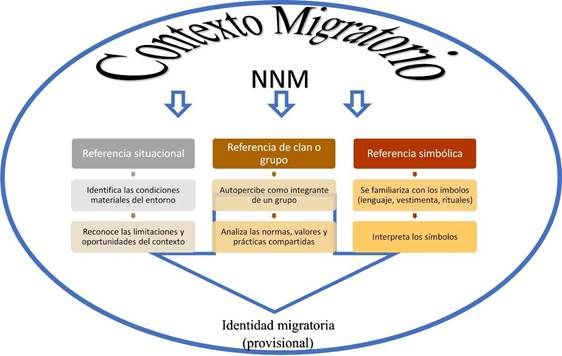 Con base en estas tres referencias, los NNM van dándole significados a un cúmulo de elementos que determinarán una interacción, y les permitirá ser visibles ante el grupo y posteriormente ante la sociedad de acogida. El proceso para definir la identidad les permitirá, no solo ser pensados como sujetos con discursos propios y capacidad de apropiarse de objetos tanto sociales como simbólicos, también les otorga la capacidad de ser agentes sociales ante sus pares y frente a los docentes de la escuela (ver Figura 1).