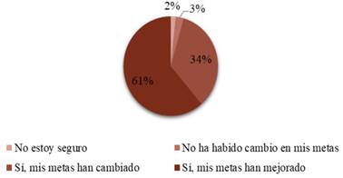 Los cambios de perspectivas a raíz del programa Jóvenes a la U indican un impacto positivo significativo. Los datos muestran que 388 estudiantes (61%) reportaron que sus metas han mejorado, mientras que 217 (34%) manifestaron que sus metas han cambiado (ver Figura 8). Esto sugiere que el programa no solo ha ampliado los horizontes educativos y profesionales de los participantes, sino que también ha provocado una profunda transformación en sus mentalidades y aspiraciones.