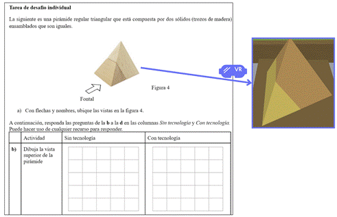 Finalizada la tarea 3, se planteó un desafío que inició con identificar las vistas de una pirámide formada por dos trozos iguales, dibujarlas para la pirámide (superior, frontal, trasera) y el trozo (superior, derecha), y finalmente respondieron a la pregunta ¿Son los dos trozos de madera iguales? Cuestionando al enunciado y justificando desde su experiencia con y sin RV.