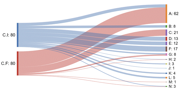 El cuestionario inicial (C.I.) evidenció 12 tipos de respuestas (considerar que, al ser 5 figuras geométricas, cada una tiene 4 vistas a las que responder, por lo que, al ser 4 estudiantes participantes, el total de respuestas en cada cuestionario es 80), de las cuales se aprecia que en mínima parte corresponden a respuestas del Tipo A (ver Figura 12). Mientras que el cambio evidenciado en el cuestionario final (C.F.) tuvo una tendencia mayoritaria (65%) hacia respuestas Tipo A (de un total de 6 tipos de respuestas).