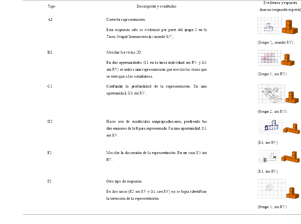 En aspectos generales, G1 no demostró tener avances significativos en sus representaciones durante la Tarea Instrumentada realizada de manera grupal (tareas 2 y 3), sin embargo, sus representaciones cambian de tener errores estructurales, de orientación y de intercambio de vistas, a considerar perspectivas al observar desde el entorno virtual. Mientras que G2 debido al tiempo no logró colorear sus representaciones; aun así, su cambio fue hacia tener respuestas del tipo A; sin embargo, debido a que en un inicio cometieron errores en cuanto a orientación y ubicación de cuadrados, estos se lograron corregir usando RV.