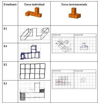 En relación con las tareas de dibujar un cuerpo geométrico 3D a partir de sus vistas ortogonales (ver ejemplo de la Figura 14), ningún alumno demostró dominar la representación de la figura en la tarea individual (tarea 1, parte 3). En cambio, cuando se trabajó en grupos (tarea 3), solo G2 por medio de la RV logró dibujar correctamente la figura 3D.