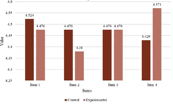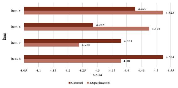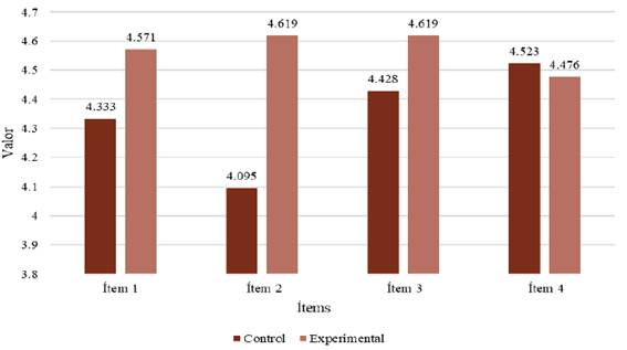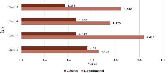 En cuanto a la Dimensión 2, la Figura 5 muestra que el grupo experimental obtuvo una ventaja mayor en los ítems relacionados con la utilización de recursos auténticos y la vinculación de las actividades con los objetivos del programa.