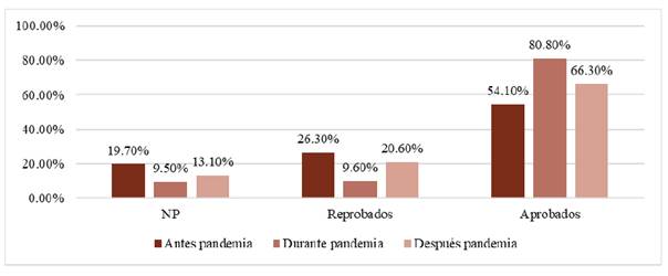 Con base en los datos recolectados, se pudo constatar que las estadísticas del rendimiento académico mostrado en los períodos académicos durante la pandemia sufrieron cambios significativos en comparación a los períodos académicos previos a esta crisis sanitaria, desde una reducción en estudiantes con NP o con reprobación, hasta un alto aumento de aprobación.