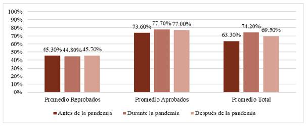 En la Figura 2 se observa el comportamiento de las calificaciones en términos de la reprobación, aprobación y en general. En este último, se observa que el promedio de las calificaciones obtenidas por los estudiantes en el espacio pedagógico de Matemáticas fue mayor durante los períodos académicos de la Pandemia.