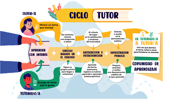 La metodología Tutoría entre Pares (TeP) también llamada Redes de Tutoría (Cámara, 2020), tiene su origen en México y está inspirada en el pensamiento de Paulo Freire y la educación popular. Se implementó por primera vez en escuelas rurales y marginalizadas. Esta tutoría tiene algunos principios fundamentales como la importancia del aprendizaje con interés, derribar jerarquías académicas, pues todas las personas pueden aprender y enseñar en un marco de respeto a los distintos ritmos de aprendizaje, propiciando la reflexión a través de la metacognición. Se desarrolla en una sesión entre tutor/a y tutorado/a, quien elige un tema de su interés dentro de un catálogo que se trabaja a través de preguntas y desafíos, incentivando el descubrimiento por medio de la investigación de los/as tutorados/as. Posteriormente, la persona que es tutorada presenta sus aprendizajes en una demostración pública y tras un proceso de aprendizaje se convierte en tutor/a (Cámara, 2020).
