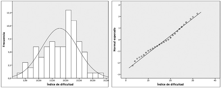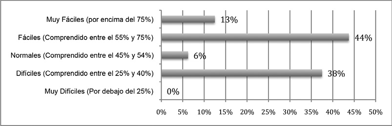 • La idoneidad cognitiva de un instrumento es el grado de dificultad que representan los ítems de dicho instrumento, es decir, el grado de representatividad de los significados evaluados respecto a los significados personales. En nuestro estudio los resultados ponen de manifiesto que el grado de dificultad del instrumento es medio-alta, puesto que los índices van de una dificultad difícil hasta una dificultad muy fácil, no hay ítem con dificultad muy difícil (índices inferiores al 25%). Y la prueba de normalidad confirma dicha distribución del grado de dificultad.