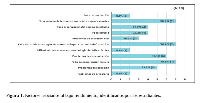 Entre los principales factores asociados al bajo rendimiento académico se observaron la falta de relación de los nuevos conocimientos teóricos adquiridos con las actividades y resolución de casos clínicos desarrollados durante las horas prácticas, falta de uso de estrategias de aprendizaje, problemas de comprensión lectora y de concentración, con el 38.8 % respectivamente (figura.1). Acevedo12, en una investigación que tuvo como objetivo identificar la relación entre comprensión lectora y rendimiento académico en 49 estudiantes de primer año de psicología de una universidad colombiana, encontraron que el 67.3% de los estudiantes sólo alcanzaron el nivel más básico de comprensión lectora (de cinco niveles), demostrando una relación directamente proporcional entre este nivel mínimo de comprensión lectora y el rendimiento académico general.