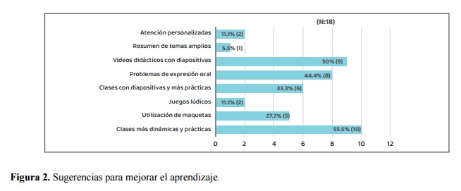 Con relación a las sugerencias de los estudiantes, los resultados obtenidos fueron: hacer clases más dinámicas y prácticas, así como videos con diapositivas narrados por los docentes que imparten el componente de Histoembriología bucodental (figura. 2).