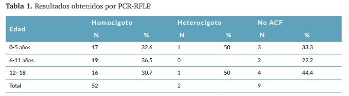 En relación con los resultados de la digestión enzimática, se encontró que el 82.5% de los pacientes presentan ACF en su estado homocigotos, 3.2% ACF heterocigotos y el 14.3% no presentaron resultados de ACF. Los resultados por edad están expresados en la (tabla 1), reflejando que el mayor número de casos homocigotos se presentó en las edades de 6-11 años.
