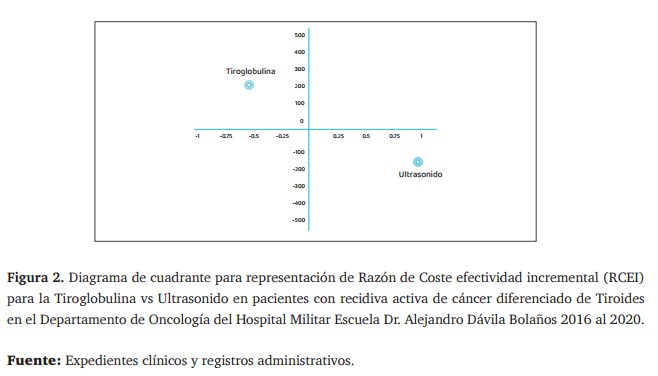 La figura 2 muestra la diferencia entre los costos y efectividad de la TG versus el USG para la detección de recidivas del cáncer de tiroides y para la toma de decisión con respecto al análisis coste-efectividad. Para el primer cuadrante no son recomendables tomar las alternativas, ya que, en comparación al USG la Tiroglobulina es menos efectiva (-0.48) y más cara (113.06 USD) la fórmula utilizada fue:
