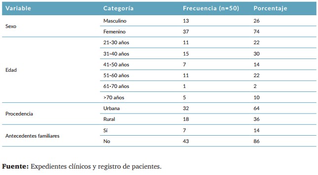Entre el 1 de enero de 2015 y el 31 de diciembre de 2020, se registraron 50 pacientes con recurrencia de cáncer diferenciado de tiroides en el Departamento de Oncología del HMEADB. De estos, el 74% (37 pacientes) correspondían a mujeres y el 26% (13 pacientes) a hombres. La distribución por sexo de los pacientes se presenta en la (Tabla 1).