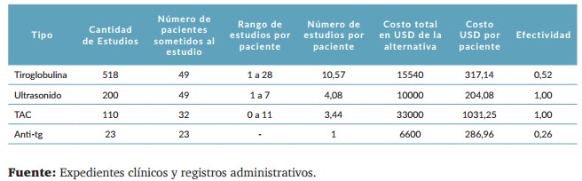 En el caso de la Anti-Tiroglobulina, demostró poseer poca eficiencia diagnostica, y se reportaron gastos excesivos diagnósticos con el uso de este método y la TAC, aunque efectiva en el 100% demostró una carga económica alta para el servicio. La limitación en el número de pacientes a quienes se evaluó por resonancia magnética no permitió evaluar la efectividad global. En este contexto, se puede concluir que la tiroglobulina no debería ser considerada como una opción viable para el seguimiento de todos los pacientes con cáncer de tiroides, ya que resulta en un gasto innecesario, sin una mejora en la detección de recurrencias, por lo que su uso debe estar justificado.