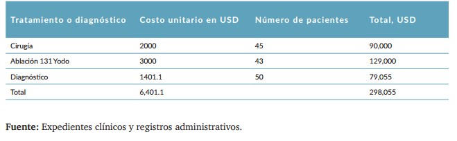 Según el tratamiento realizado a los pacientes (Tabla 4), de los 50 estudiados, a 43 pacientes se les realizó ablación con 131 Yodo, si se considera que el costo del 131 Yodo es de $3000 dólares, el costo total sería de $129,000 dólares para el total de pacientes.