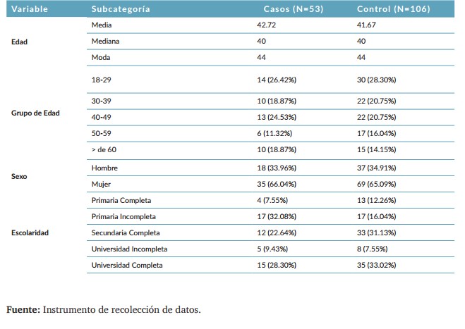 En cuanto a las características socio demográficas; la edad promedio en los pacientes con HTA (casos) fue de 42.72 y en los controles fue de 41.67 años. Entre los grupos de edad en los casos el más frecuente es el de 18 – 29 con un 26.42% y en los controles con un 28.30%. La proporción de hombres y mujeres es similar en ambos grupos. Aproximadamente un tercio son hombres y dos tercios son mujeres, siendo las mujeres las más frecuentes en ambos grupos. La mayoría de los participantes en ambos grupos tienen un nivel de educación de secundaria o universidad completa (Tabla 1). Hay algunas diferencias en las proporciones de cada nivel educativo, pero no parecen ser muy grandes.