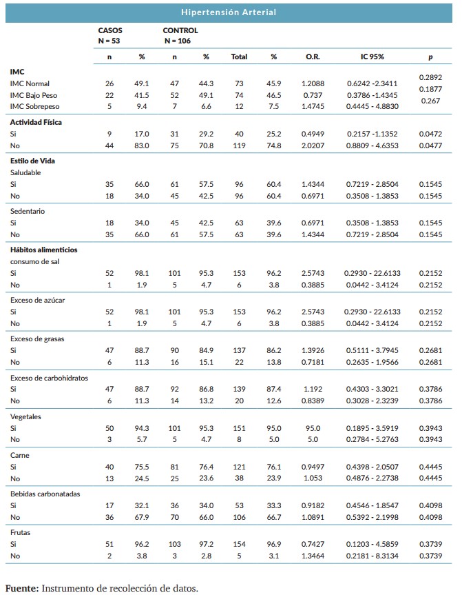 Se analizaron diferentes factores de riesgo como el índice de masa corporal (IMC), la actividad física, el estilo de vida y los hábitos alimenticios. En cuanto al IMC, no se encontraron diferencias significativas entre los grupos en cuanto a la prevalencia de IMC normal, bajo peso o sobrepeso. Las personas con hipertensión arterial mostraron una menor frecuencia de actividad física con el 17% en comparación con el grupo control 29.2% (Tabla 2), esta diferencia fue estadísticamente significativa, lo que sugiere que la falta de actividad física podría ser un factor de riesgo para la hipertensión (p=0.0477). Las personas inactivas tuvieron un riesgo 2 veces mayor de presentar hipertensión en comparación con las activas.