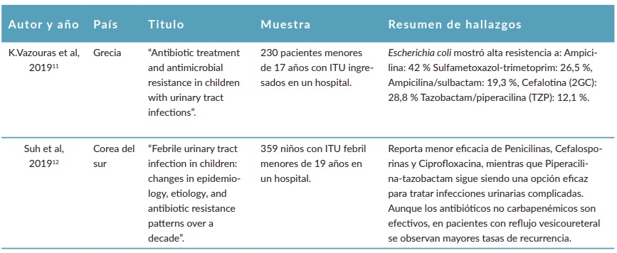 A través de la revisión bibliográfica se incluyeron 23 publicaciones sobre resistencia bacteriana a Escherichia coli en infección de vías urinarias de pacientes pediátricos, las que se describen en la tabla 1.