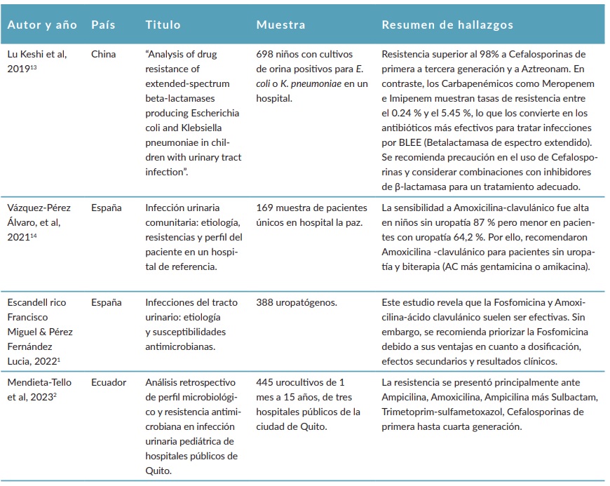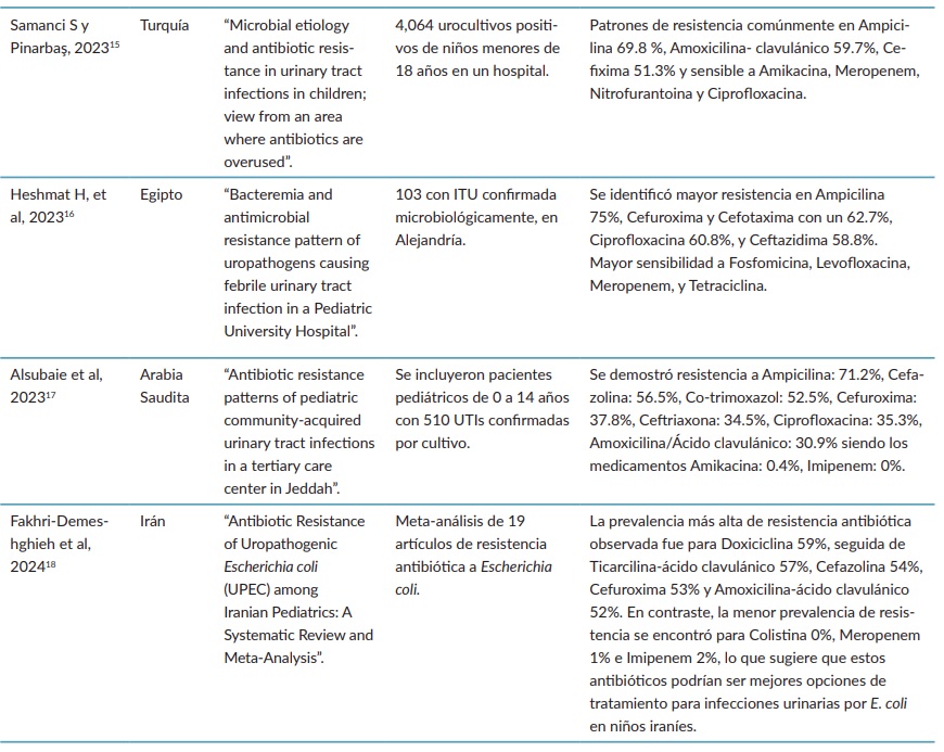 Tabla 1. Estudios sobre resistencia antibiótica de Escherichia coli en ITU pediátricas (2019-2024).