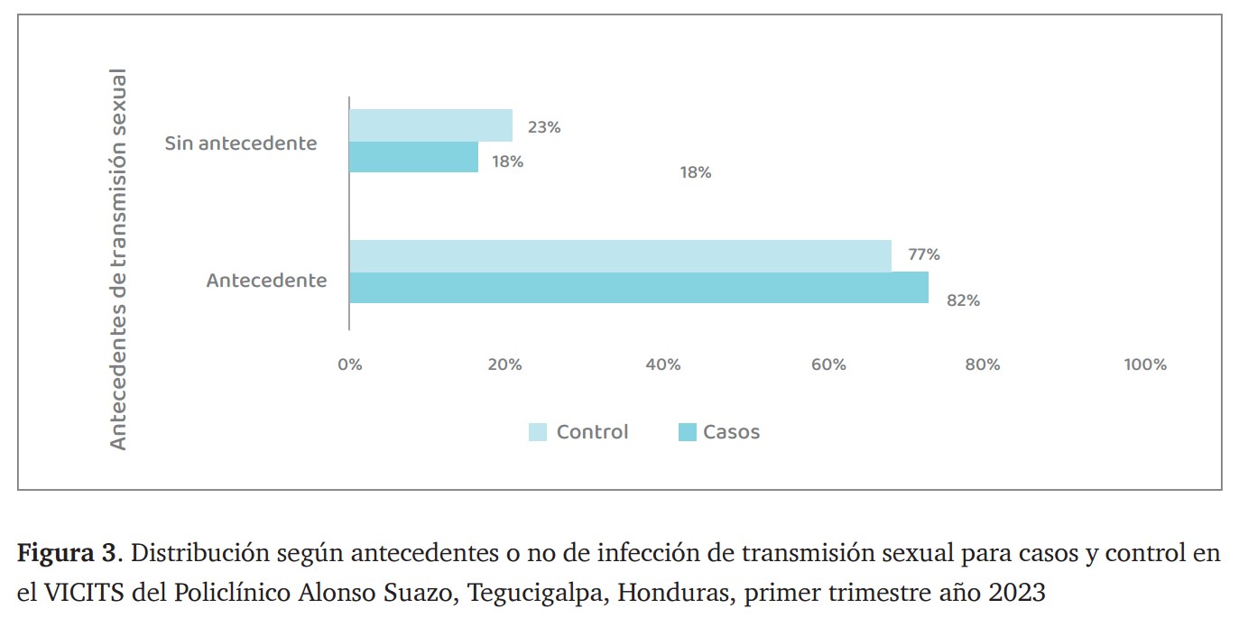 Del total de pacientes con condilomas, el 82% (n=33/40) presentaba antecedentes de infecciones de transmisión sexual, mientras que el 18% (n=7/40) no reportó dichos antecedentes. En el grupo control, el 77% (n=31/40) también refirió antecedentes de ITS, y el 23% (n=9/40) no los presentó, (figura 3).