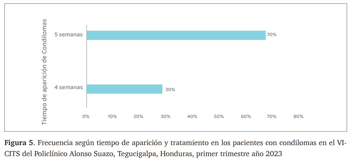 Del total de pacientes con condilomas que recibieron tratamiento con ácido tricloroacético, el 70 % (n=28/40) lo recibió después de 5 semanas desde la detección, mientras que el 30 % (n=12/40) lo recibió tras 4 semanas, (figura 5).