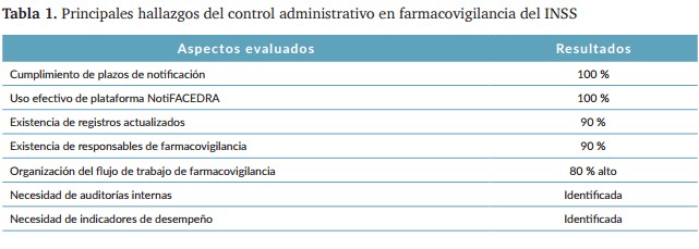 Particularmente, el control administrativo en farmacovigilancia ha mostrado avances significativos en el contexto del INSS. La implementación sistemática de la plataforma NotiFACEDRA para la notificación de eventos adversos, el cumplimiento generalizado de los plazos de reporte y la estructuración progresiva de los registros de farmacovigilancia en las unidades de salud representan logros destacados. Estos avances son especialmente relevantes si se considera que el sistema de farmacovigilancia del INSS aún se encuentra en una fase inicial de desarrollo, lo que resalta el compromiso institucional con la seguridad del paciente y la mejora de los procesos asistenciales.
