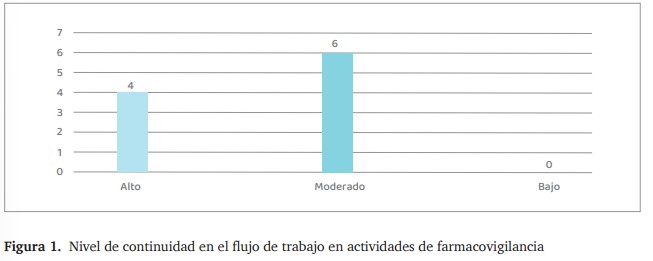 - Cuatro unidades de salud mostraron un flujo de trabajo alto, es decir, las actividades de farmacovigilancia se realizaban sin interrupciones y con una ejecución organizada. En estas unidades, los procedimientos de notificación y seguimiento se desarrollaban de manera sistemática, con una distribución clara de responsabilidades y tiempos adecuados para la gestión de eventos adversos, (figura .1).
