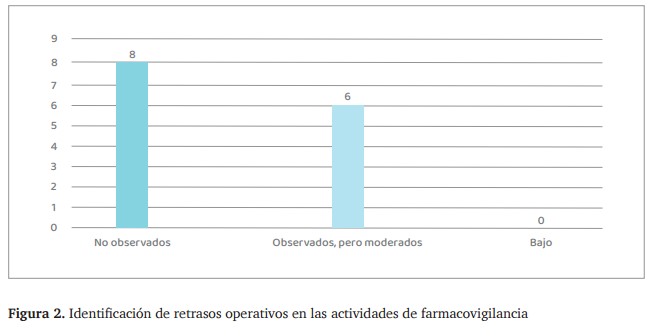 - Ocho unidades de salud no presentaron retrasos en sus procesos administrativos de farmacovigilancia (figura.2). En estas unidades, las actividades de notificación y registro de eventos adversos se realizaban en los tiempos establecidos, con personal disponible para la ejecución de estas tareas sin interferencias en su flujo de trabajo.